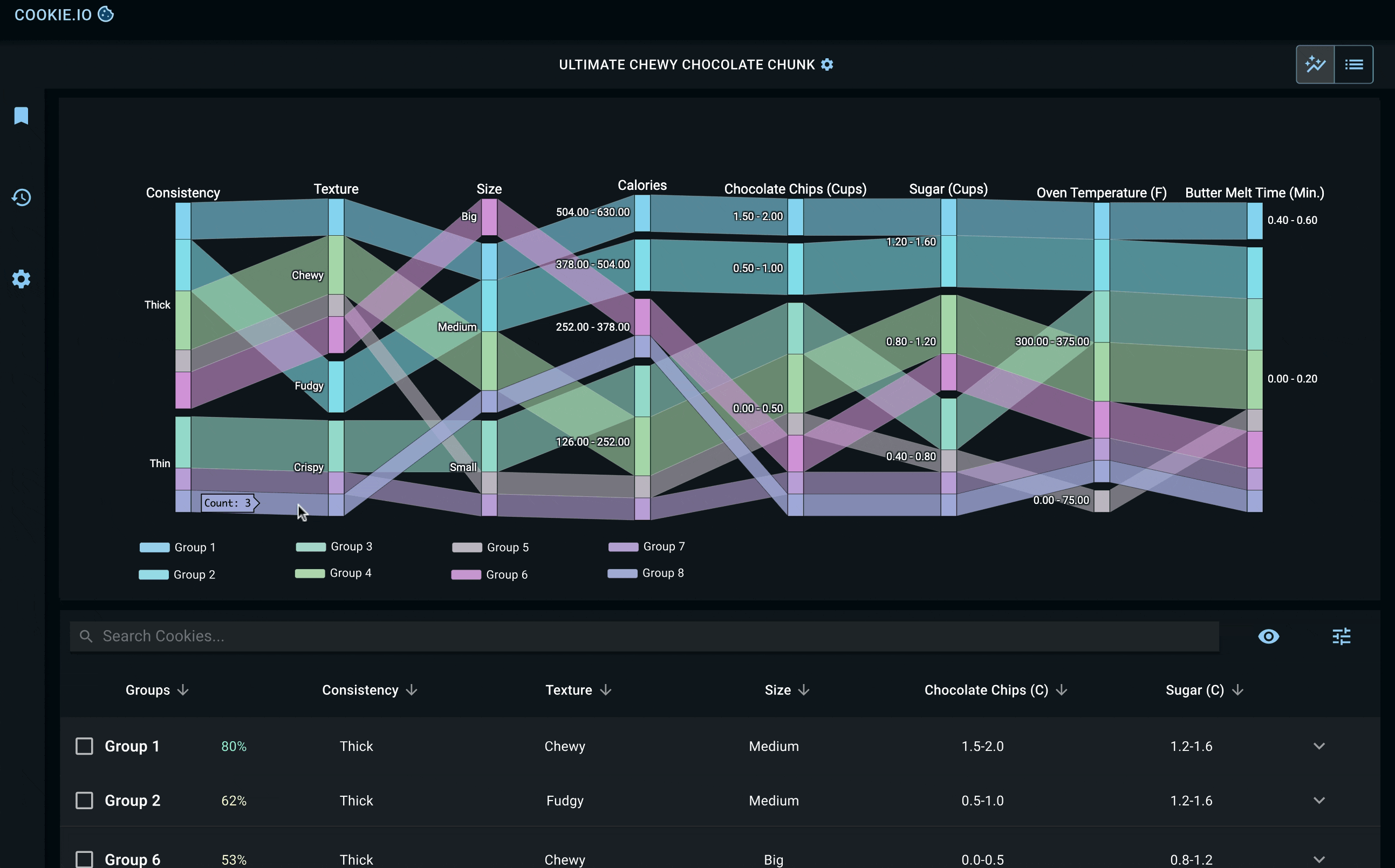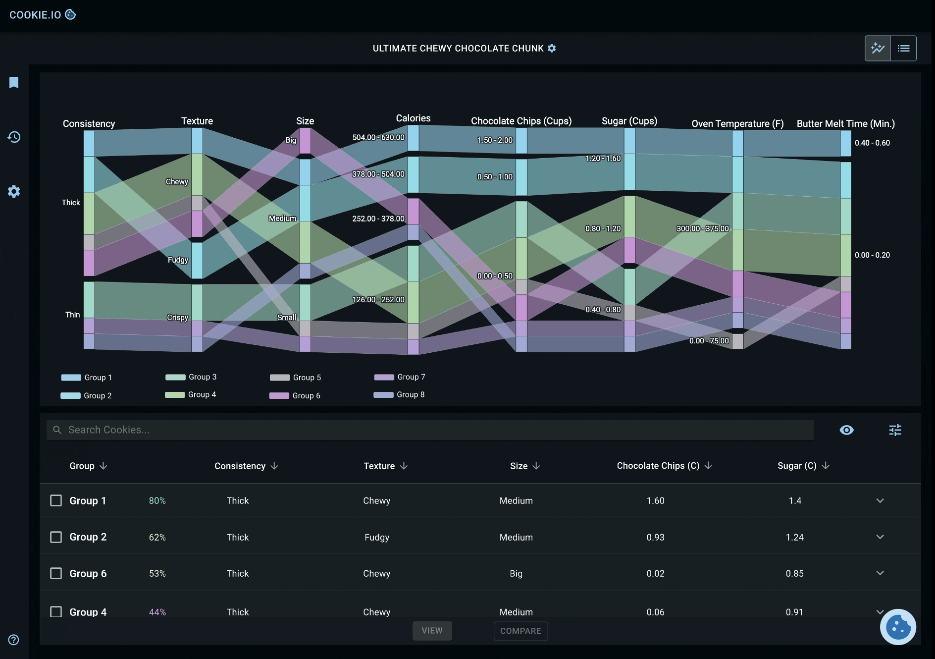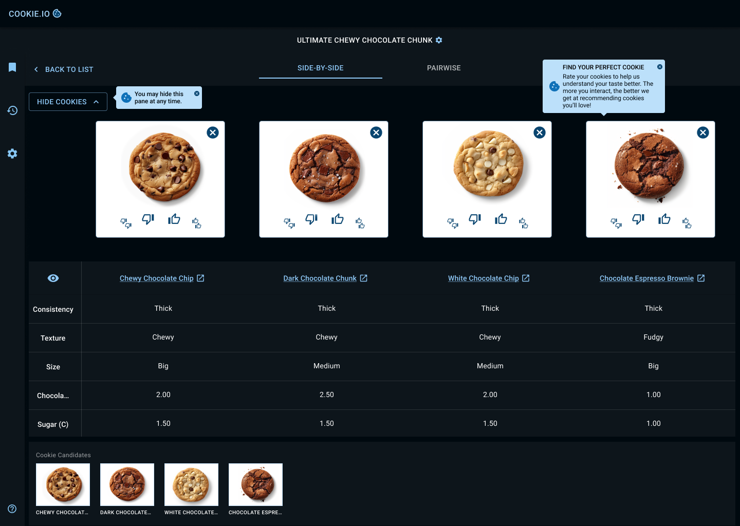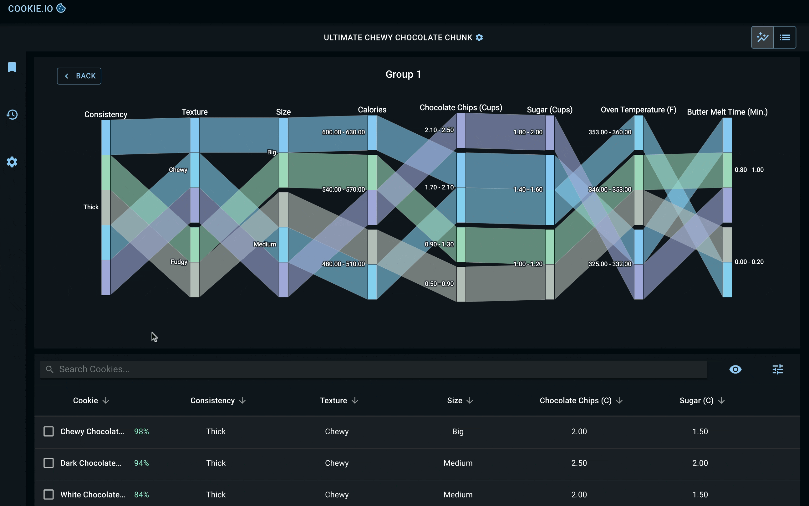 Below, you'll find key screens detailing a baker's mission to find the 'Ultimate Chewy Chocolate Chunk Cookie'. Once they've defined their cookie preferences and uploaded their cookie dataset, they're given the tools to explore relationships between different groups of cookies (clustered by SOMs) and the individual cookies within each group. Each cookie group and its constituent cookies are ranked based on how closely they align with the baker's target values.